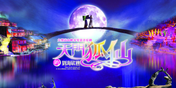 《天門(mén)狐仙--新劉?抽浴肥鞘澜缟系谝慌_(tái)以高山奇峰為舞臺(tái)背景,以山澗峽谷為表演舞臺(tái)的山水實(shí)景演出;也是目前世界第一臺(tái)有完整故事情節(jié)的山水實(shí)景音樂(lè)歌舞劇。特別值得一提的是,張家界天門(mén)山奇峰險(xiǎn)壑、飛瀑流泉、山上林木花草皆成為該劇舞美效果的構(gòu)成元素,也成為該劇實(shí)現(xiàn)特殊藝術(shù)表現(xiàn)力和巨大視覺(jué)沖擊力的獨(dú)特資源。該劇宏大而絢麗的視覺(jué)特效令人驚嘆,特別是橫跨峽谷跨度達(dá)60米的高空飛橋、奇幻美麗的人造月亮、逼真的漫天飛雪等場(chǎng)景無(wú)不令觀眾連聲驚嘆。劇情高潮部分:天門(mén)群峰瞬間被燈光照亮,恢宏壯觀的場(chǎng)景令人感到巨大震撼。100位身著銀飾盛裝少女組成的合唱聲如天籟,100個(gè)小狐仙化身的美艷少女舞姿曼妙,唯美奇幻的舞臺(tái)效果令觀眾感覺(jué)美不勝收。劇中大型交響樂(lè)與民歌和諧交融,歌曲優(yōu)美無(wú)比,令人沉醉動(dòng)情。